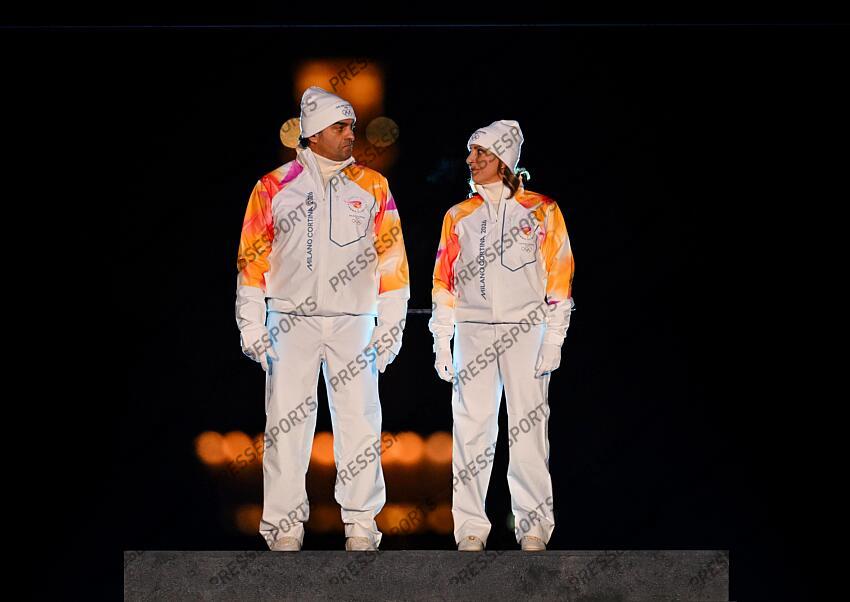 Italy's Alberto Tomba and Deborah Compagnoni during the cauldron lighting ceremony at the Arco della Pace, Milan, during the Opening Ceremony for the Milano Cortina 2026 Winter Olympics. Picture date: Friday February 6, 2026. OMNISPORTS JO MILAN CORTINA 2026 2026 CEREMONIE D'OUVERTURE STADE SAN SIRO MILAN ITALIE 06/02/2026 SANDIN CARL/POOL/L'EQUIPE Use subject to restrictions. Editorial use only, no commercial use without prior consent from rights holder.