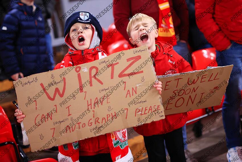 28th January 2026 - UEFA Champions League - League Phase - Liverpool v Qarabag - Young Liverpool fans hold signs up - Photo: Simon Stacpoole / Offside. LIVERPOOL-KARABAGH FC (6-0)