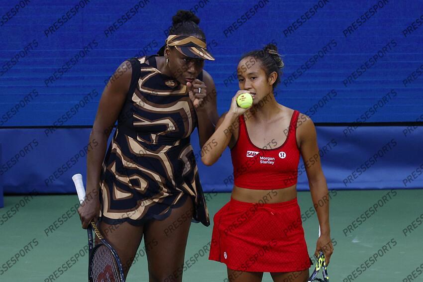 Sep 1, 2025; Flushing, NY, USA; Venus Williams (USA) talks with partner Leylah Fernandez (CAN) between points against Ekaterina Alexandrova and Shuai Zhang (CHN) (both not pictured) on day nine of the 2025 US Open tennis championships at Billie Jean King National Tennis Center. Mandatory Credit: Geoff Burke-Imagn Images US OPEN