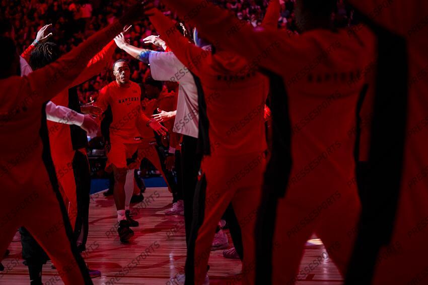 Oct 6, 2025; Vancouver, British Columbia, CAN; Toronto Raptors guard Scottie Barnes (4) walks out during player introductions prior to the start of a game against the Denver Nuggets at Rogers Arena. Mandatory Credit: Bob Frid-Imagn Images NBA: Preseason-Denver Nuggets at Toronto Raptors