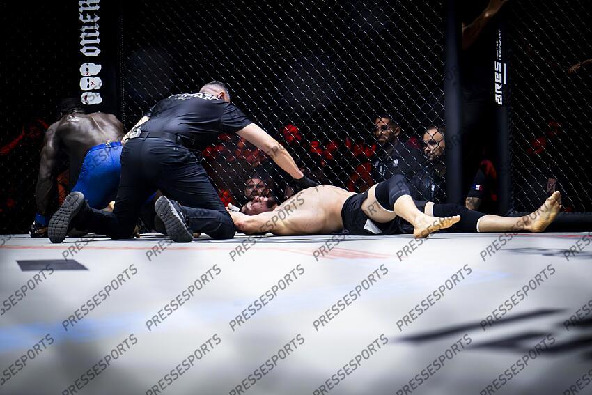 zebo (jordan) - (fra) - chamsoudinov (baysangur) - (fra) - dit baki arret arbitre MMA ARTS MARTIAUX MIXTES ARES 35 2025 CHAMSOUDINOV/ZEBO SALLE ZENITH EUROPE STRASBOURG ECKBOLSHEIM FRANCE 18/10/2025 AUTISSIER JEAN BAPTISTE photo rteouchee combat pour la ceinture poids welters