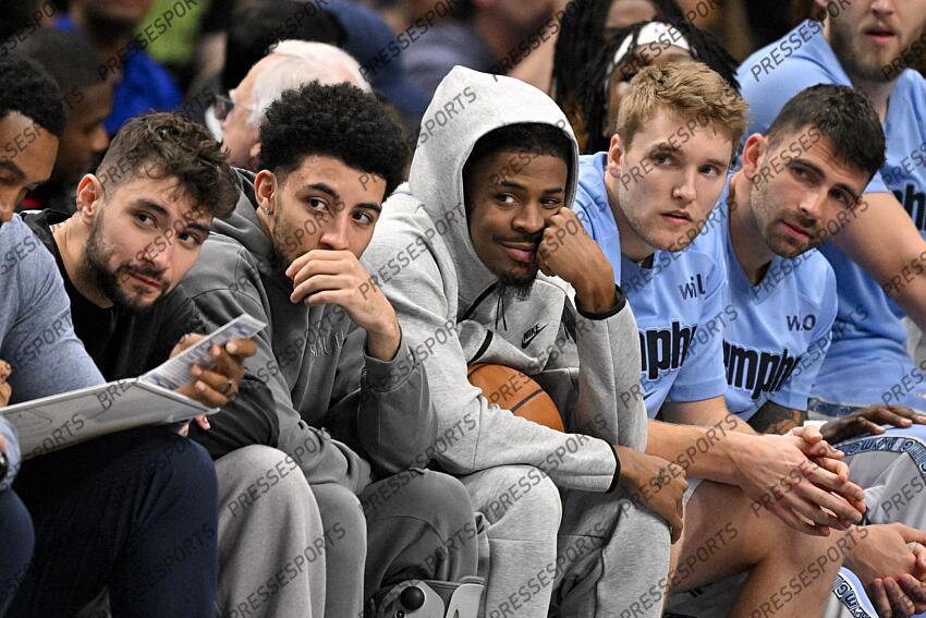 Nov 22, 2025; Dallas, Texas, USA; Memphis Grizzlies guard Ja Morant (center) looks on from the team bench during the first quarter against the Dallas Mavericks at the American Airlines Center. Mandatory Credit: Jerome Miron-Imagn Images NBA: Memphis Grizzlies at Dallas Mavericks