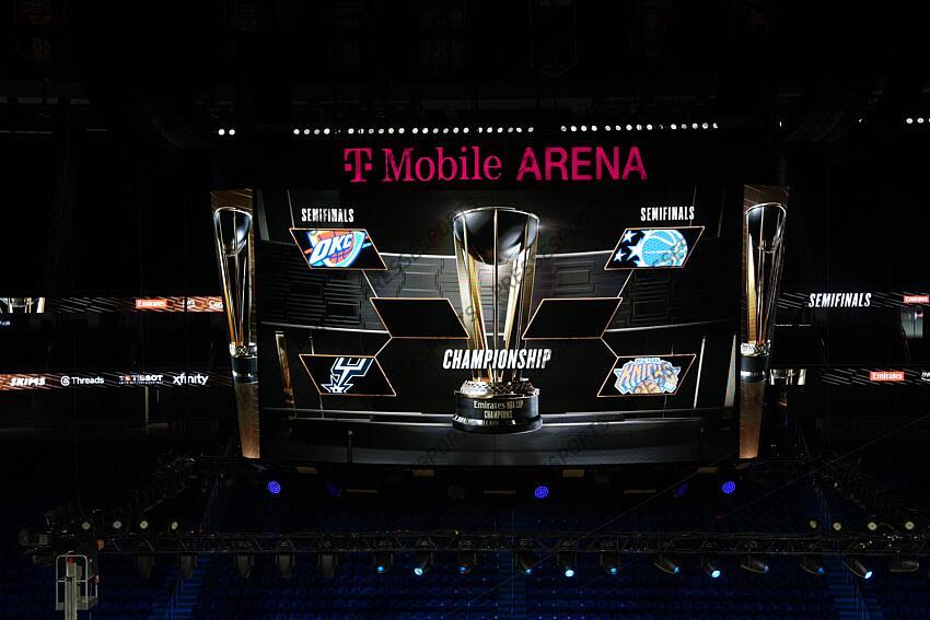 Dec 13, 2025; Las Vegas, Nevada, USA; The Emirates NBA Cup logo and semifinals bracket with the Spurs, Thunder, Magic and Knicks logo on the T-Mobile Arena video board. Mandatory Credit: Kirby Lee-Imagn Images NBA: Emirates Cup-Semi Finals-New York Knicks at Orlando Magic