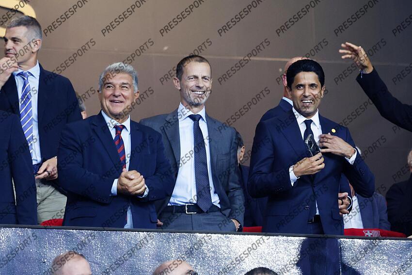 Joan Laporta (Barcelona), Aleksander Ceferin (UEFA), Nasser Al-Khelaifi (PSG), OCTOBER 1, 2025 - Football / Soccer : UEFA Champions League match between FC Barcelona 1-2 Paris Saint-Germain at the Estadi Olimpic Lluis Companys in Barcelona, Spain. (Photo by D.Nakashima/AFLO) BARCELONE-PSG (1-2) (1-2)