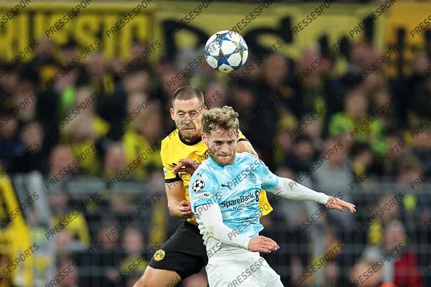 DORTMUND - (l-r) Waldemar Anton of Borussia Dortmund, Ole Didrik Blomberg of Bodo/Glimt during the Champions League match between Borussia Dortmund and FK Bodo/Glimt at Signal Iduna Park on December 10, 2025, in Dortmund, Germany. ANP | Hollandse Hoogte | Bart Stoutjesdijk BORUSSIA DORTMUND-FK BODO/GLIMT (2-2)
