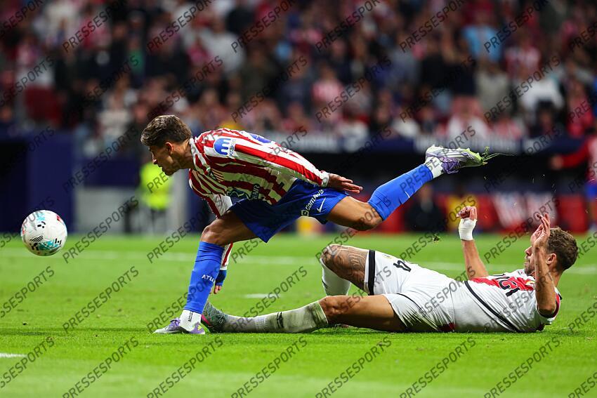 Giuliano Simeone of Atletico de Madrid and Florian Lejeune of Rayo Vallecano in action during the Spanish League, LaLiga EA Sports, football match played between Atletico de Madrid and Rayo Vallecano at Riyadh Air Metropolitano stadium on September 24, 2025, in Madrid, Spain. ATLETICO DE MADRID-RAYO VALLECANO (3-2)