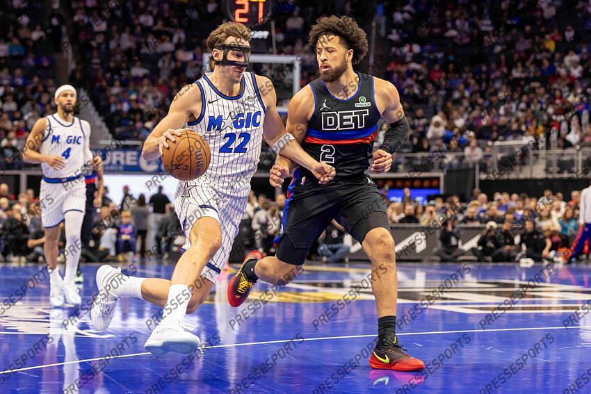 Nov 28, 2025; Detroit, Michigan, USA; Orlando Magic forward Franz Wagner (22) drives to the basket as Detroit Pistons guard Cade Cunningham (2) defends during the first quarter at Little Caesars Arena. Mandatory Credit: David Reginek-Imagn Images NBA: Orlando Magic at Detroit Pistons