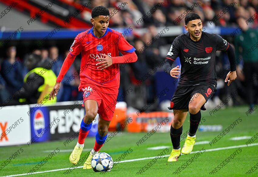 v.l. Senny Mayulu, Ezequiel Fernandez (Leverkusen) Leverkusen, 21.09.2025, Fussball, UEFA Champions League, Ligaphase - Spieltag 3, Bayer 04 Leverkusen - Paris Saint-Germain BAYER LEVERKUSEN-PSG (2-7)
