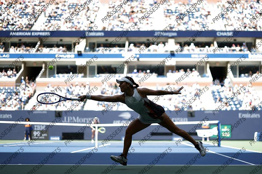 Sep 2, 2025; Flushing, NY, USA; Jessica Pegula (USA) reaches for a backhand against Barbora Krejcikova (CZE) (not pictured) on day ten of the 2025 US Open tennis championships at Billie Jean King National Tennis Center. Mandatory Credit: Geoff Burke-Imagn Images US OPEN