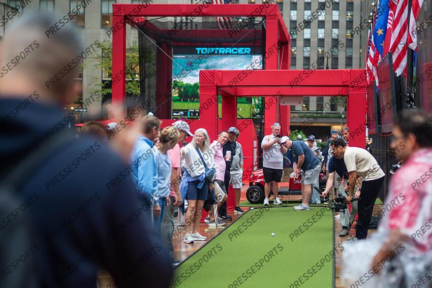 Sep 25, 2025; New York, New York, USA; Visitors play a putting game for a chance to win prizes during the Ryder Cup Live event at Rockefeller Center. Mandatory Credit: Lucas Boland-Imagn Images PGA: Ryder Cup Live
