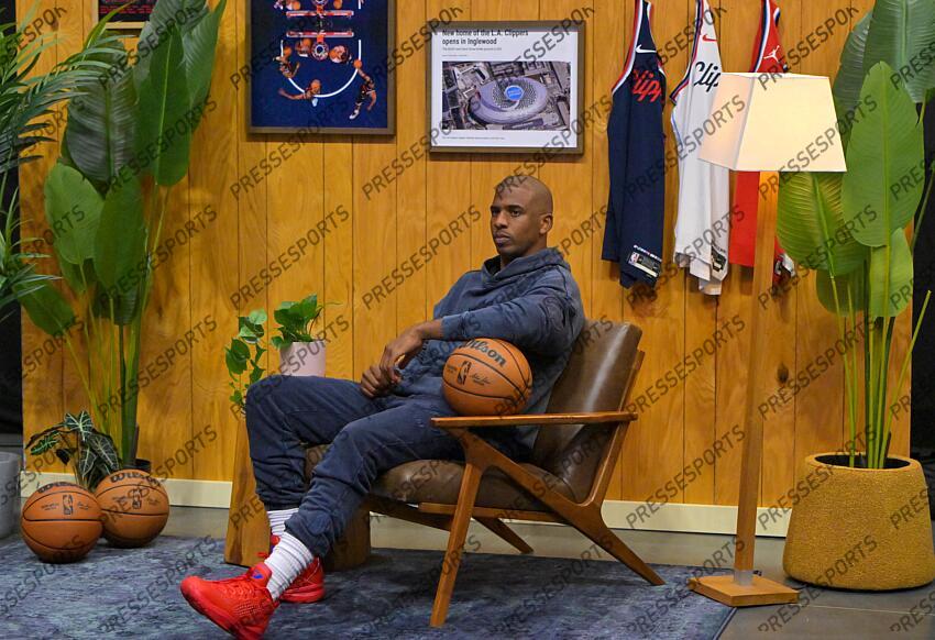 Sep 29, 2025; Inglewood, CA, USA; Los Angeles Clippers guard Chris Paul (3) poses for a merchandise photography session during media day at Intuit Dome. Mandatory Credit: Jayne Kamin-Oncea-Imagn Images NBA: Los Angeles Clippers-Media Day