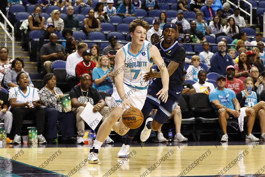 Oct 15, 2025; Greensboro, North Carolina, USA; Charlotte Hornets guard/forward Kon Knueppel (7) drives past Memphis Grizzlies guard Kentavious Caldwell-Pope (3) during first quarter action at First Horizon Coliseum. Mandatory Credit: Brian Westerholt-Imagn Images NBA: Preseason-Memphis Grizzlies at Charlotte Hornets