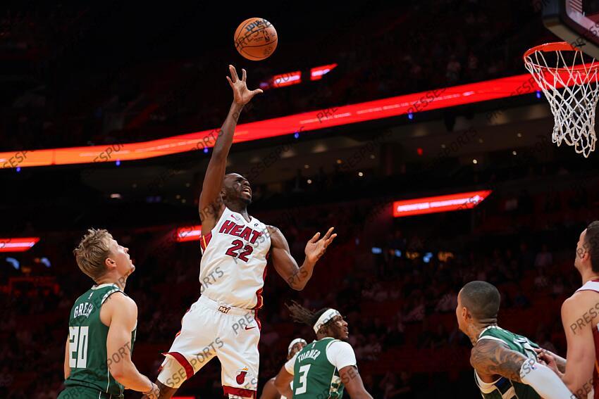 Oct 6, 2025; Miami, Florida, USA; Miami Heat forward Andrew Wiggins (22) shoots the basketball against Milwaukee Bucks guard AJ Green (20) during the first quarter at Kaseya Center. Mandatory Credit: Sam Navarro-Imagn Images NBA: Preseason-Milwaukee Bucks at Miami Heat