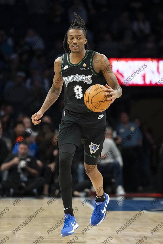 Dec 14, 2025; Minneapolis, Minnesota, USA; Minnesota Timberwolves guard Bones Hyland (8) dribbles the ball against the Sacramento Kings in the first half at Target Center. Mandatory Credit: Jesse Johnson-Imagn Images NBA: Sacramento Kings at Minnesota Timberwolves