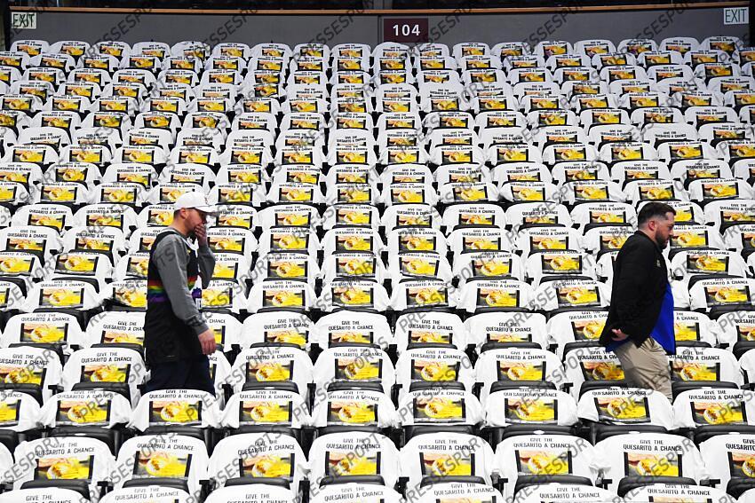 Dec 20, 2025; Denver, Colorado, USA; Fans walk to their seats through rows of Taco Bell Quesarito shirts on seats in Ball Arena before the game between the Denver Nuggets and the Houston Rockets. Mandatory Credit: Christopher Hanewinckel-Imagn Images NBA: Houston Rockets at Denver Nuggets