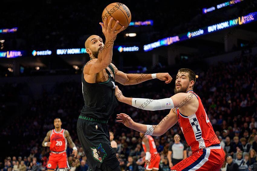 Dec 6, 2025; Minneapolis, Minnesota, USA; Minnesota Timberwolves center Rudy Gobert (27) rebounds as LA Clippers center Ivica Zubac (40) reaches in on the play in the first quarter at Target Center. Mandatory Credit: Matt Blewett-Imagn Images NBA: Los Angeles Clippers at Minnesota Timberwolves