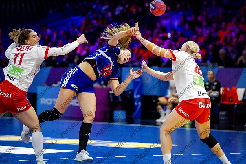 ROTTERDAM - Line Haugsted (DEN), Clarisse Mairot (FRA), and Michala Elsberg Moller (DEN) during the World Handball Championship quarterfinal between Denmark and France in Ahoy Rotterdam. ANP ROBIN VAN LONKHUIJSEN DANEMARK-FRANCE (26-31)