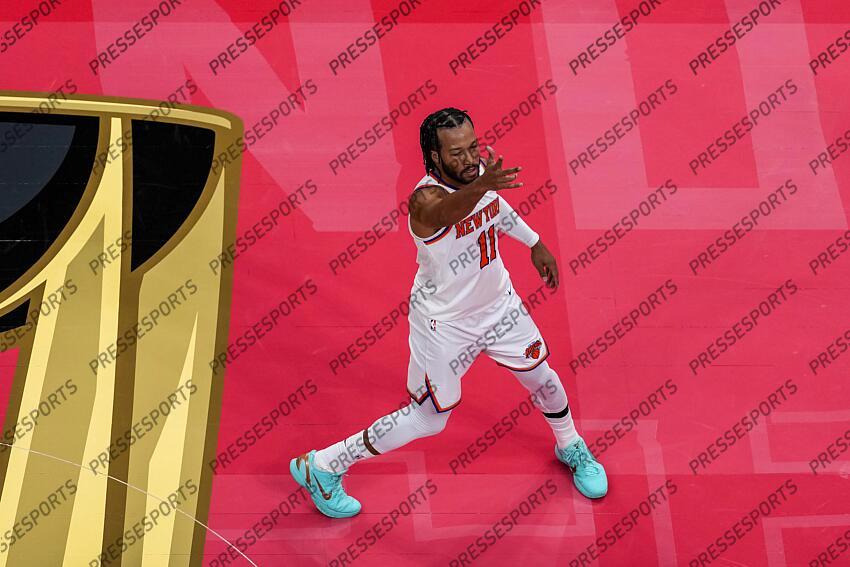 Dec 9, 2025; Toronto, Ontario, CAN; New York Knicks guard Jalen Brunson (11) celebrates scoring against the Toronto Raptors during the first half at the 2025-26 NBA Emirates Cup at Scotiabank Arena. Mandatory Credit: Kevin Sousa-Imagn Images NBA: New York Knicks at Toronto Raptors