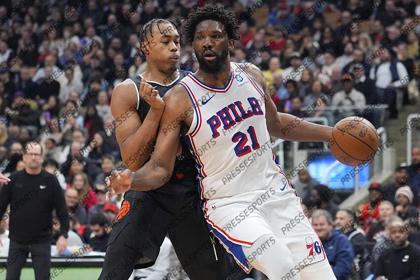 Jan 12, 2026; Toronto, Ontario, CAN; Philadelphia 76ers center Joel Embiid (21) drives to the net against Toronto Raptors guard Scottie Barnes (4) during the first half at Scotiabank Arena. Mandatory Credit: John E. Sokolowski-Imagn Images NBA: Philadelphia 76ers at Toronto Raptors