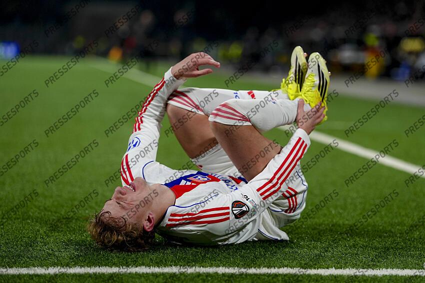 Schweiz: UEFA Europa League 2025/26, BSC Young Boys vs Olympique Lyonnais - Stadion Wankdorf, Bern: Adam Karabec 7 Lyon auf dem Rasen nach einem Foul Bern Stadion Wankdorf Bern Schweiz Switzerland UEFA Europa League 2025 26, BSC Young Boys vs Olympique Lyonnais Stadion Wankdorf, Bern Adam Karabec 7 Lyon on the pitch after a foul Bern Stadion Wankdorf Bern Switzerland Copyright: xKjetilxWaberx YOUNG BOYS BERNE-LYON (0-1)