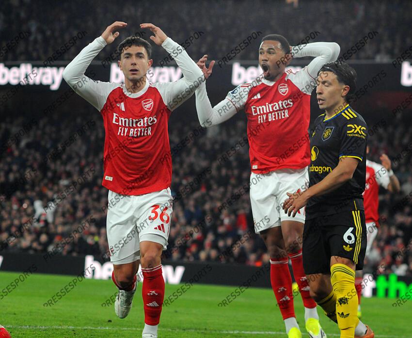 Football - 2025 / 2026 Premier League - Arsenal vs Manchester United, ManU - Emirates Stadium - Sunday 25th January Martin Zubimendi and Gabriel of Arsenal show their frustration after a missed chance PUBLICATIONxNOTxINxUK ARSENAL-MANCHESTER UNITED (2-3)