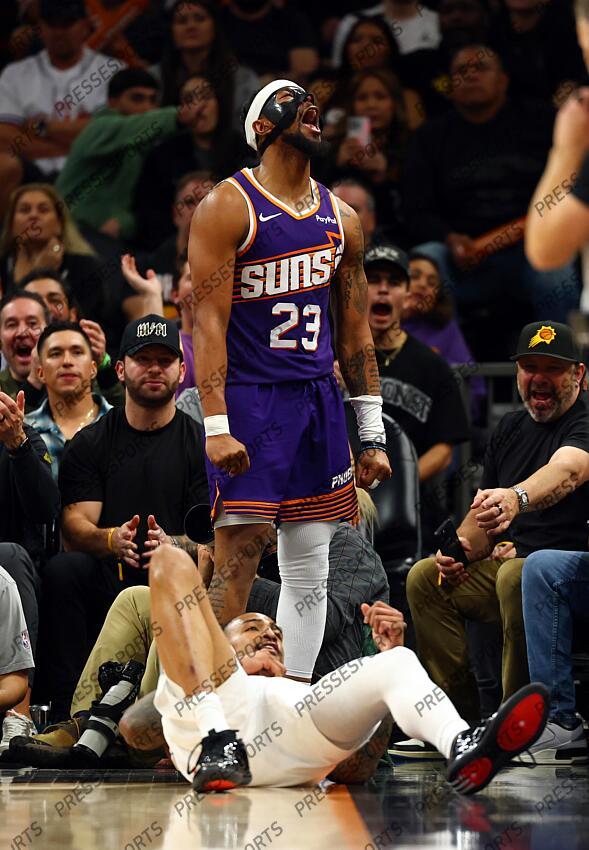 Feb 1, 2026; Phoenix, Arizona, USA; Phoenix Suns guard Jordan Goodwin (23) celebrates a play against the Los Angeles Clippers in the second half at Mortgage Matchup Center. Mandatory Credit: Mark J. Rebilas-Imagn Images NBA: Los Angeles Clippers at Phoenix Suns