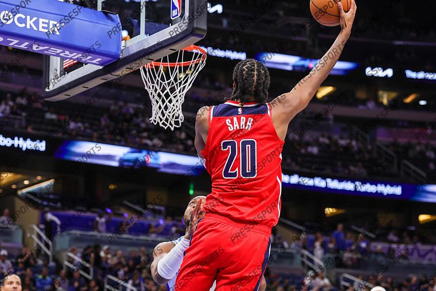 Mar 12, 2026; Orlando, Florida, USA; Washington Wizards center Alex Sarr (20) goes to the basket during the first quarter against the Orlando Magic at Kia Center. Mandatory Credit: Mike Watters-Imagn Images NBA: Washington Wizards at Orlando Magic