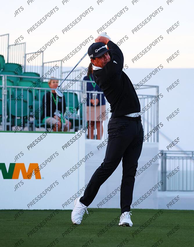 Feb 5, 2026; Scottsdale, Arizona, USA; Michael Thorbjornsen of the United Sates tees off hole 1 during the first round of the WM Phoenix Open golf tournament. Mandatory Credit: Anna Carrington-Imagn Images PGA: WM Phoenix Open - First Round