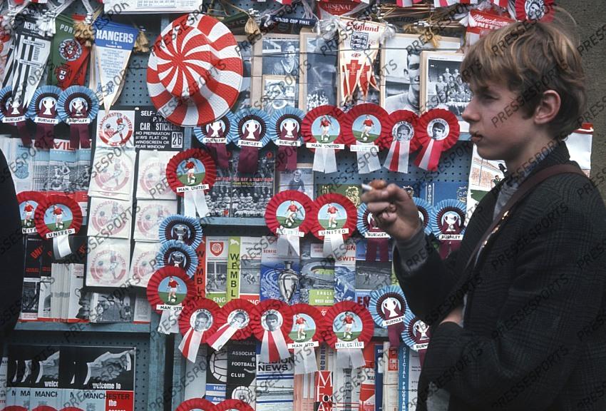 4 February 1967 - Football League Division One - Burnley - Burnley v Manchester United - A young fan smokes a cigarette by a merchandise seller outside Turf Moor. - (photo by Gerry Cranham / Offside)