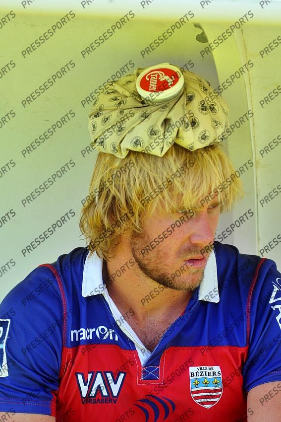 Rugby. Pro D2. Béziers. Stade de la Méditerranée. Béziers (en rouge et bleu) 22-Mont-de-Marsan (en blanc) 21. Le centre biterrois Conrad Marais. Mont-de-Marsan qualifié pour les demi-finales d'accession au Top 14. 10/05/15. Photo Robert FAGES