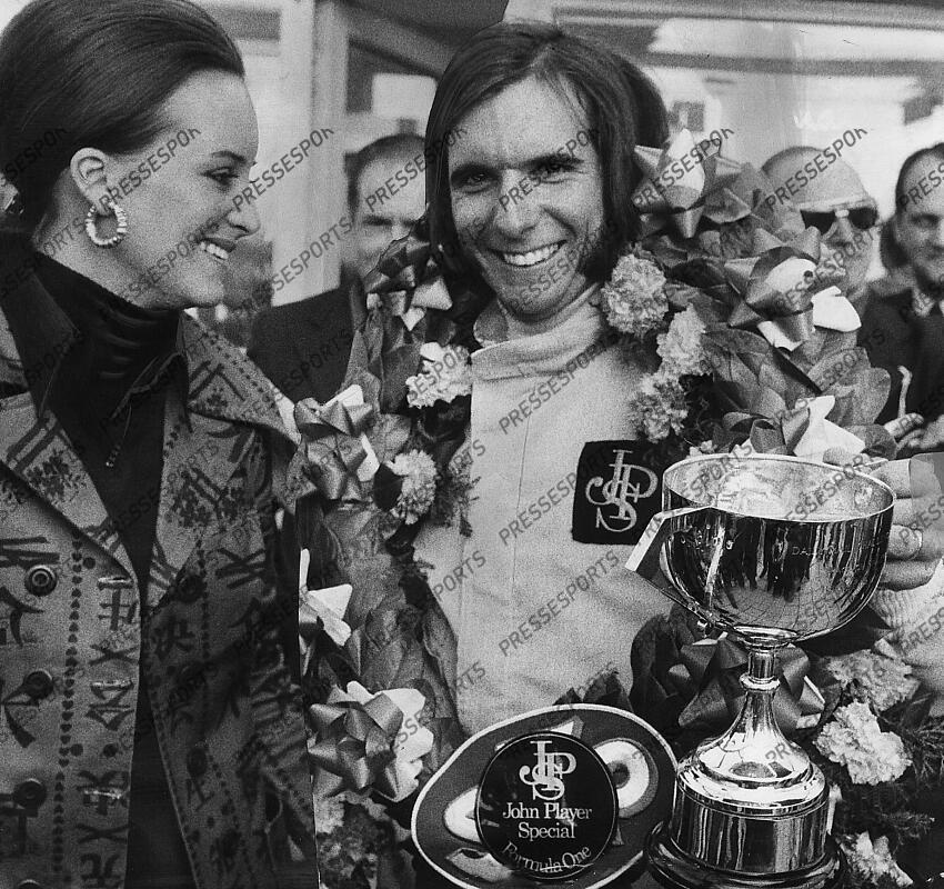 Emerson Fittipaldi wins the British Grand Prix at Brands Hatch stands with wife Marina Elina