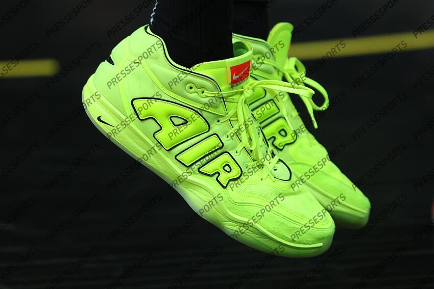 Mar 27, 2024; Salt Lake City, Utah, USA; A general view of the shoes worn by Utah Jazz forward Lauri Markkanen (23) before a game against the San Antonio Spurs at Delta Center. Mandatory Credit: Rob Gray-USA TODAY Sports NBA: San Antonio Spurs at Utah Jazz