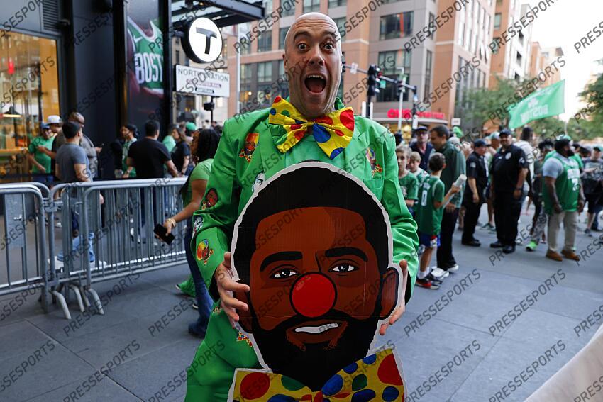 Jun 17, 2024; Boston, Massachusetts, USA; A Boston Celtics fan holds up a cutout of Dallas Mavericks guard Kyrie Irving (not pictured) in a clown outfit before game five of the 2024 NBA Finals between the Boston Celtics and the Dallas Mavericks at TD Garden. Mandatory Credit: Peter Casey-USA TODAY Sports Dallas Mavericks at Boston Celtics