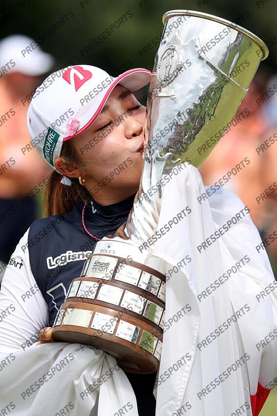 FRANCE, EVIAN-LES-BAINS, JULY 14. Ayaka Furue of Japan celebrates victory with the cup during the fourth round of the Amundi Evian Championship at Evian Resort Golf Club on July 14, 2024 in Evian-les-Bains, France. (Photo by Manuel Blondeau/ AOP.Press/AFLO) THE AMUNDI EVIAN CHAMPIONSHIP