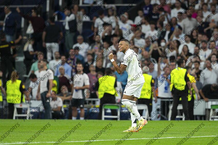 Kylian Mbappe of Real Madrid celebrates a goal during the UEFA Champions League 2024/25 League Phase MD1 match between Real Madrid CF and VfB Stuttgart at Estadio Santiago Bernabeu on September 17, 2024 in Madrid, Spain. REAL MADRID-VfB STUTTGART (3-1)