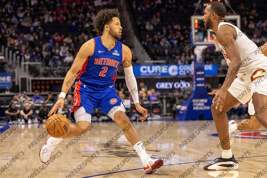 Feb 5, 2025; Detroit, Michigan, USA; Detroit Pistons guard Cade Cunningham (2) moves the ball up court on Cleveland Cavaliers forward Evan Mobley (4) during the first half at Little Caesars Arena. Mandatory Credit: David Reginek-Imagn Images NBA: Cleveland Cavaliers at Detroit Pistons
