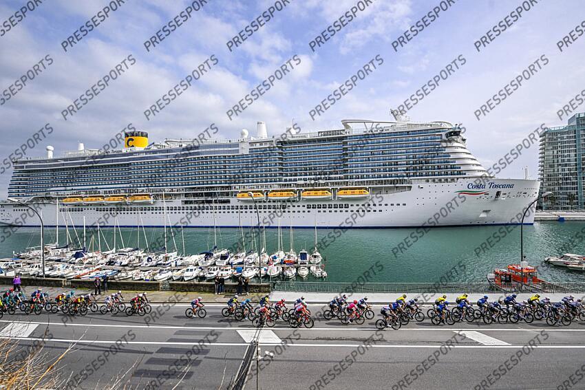SANREMO, ITALY - MARCH 22 : Illustration picture of the peloton during the UCI WorldTour 116th Milan - Sanremo cycling race with start in Pavia and finish at the Via Roma in Sanremo on March 22, 2025 in Sanremo, Italy, 22/03/2025 ( Motordriver Kenny Verfaillie - Photo by Nico Vereecken / PhotoNews MILAN/SAN REMO
