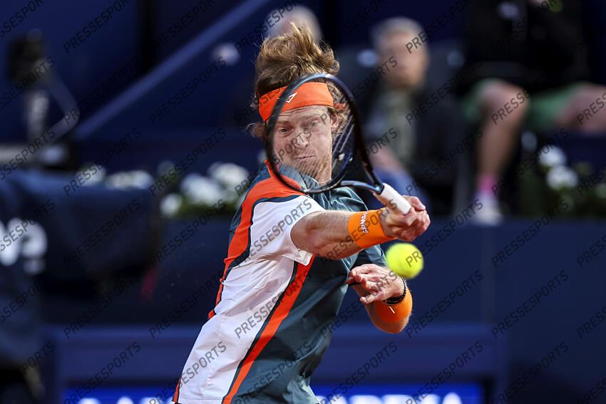 Andrey Rublev of Russia in actions against Albert Jesper De Jong of Netherlands during the first round tennis match of the Barcelona Open Banc Sabadell - Conde Godo 2025 Day 1 at Real Club De Tenis Barcelona on April 14, 2025 in Barcelona, Spain. OPEN DE BARCELONE