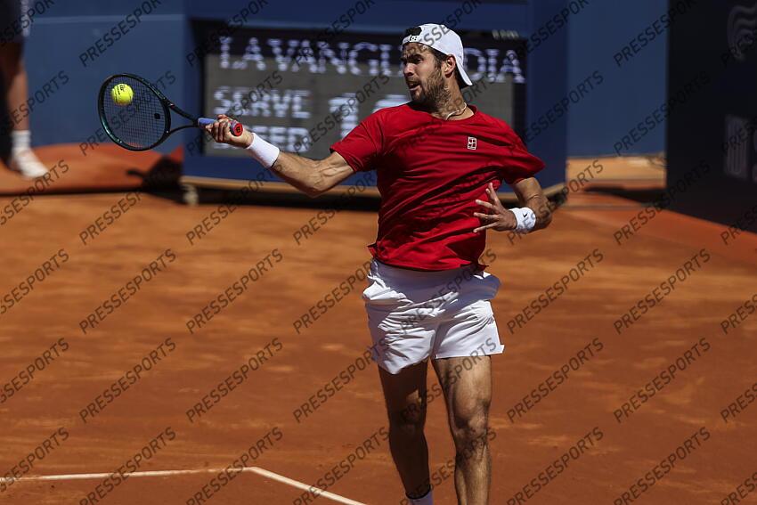 Karen Khachanov of Russia in actions against Jauma Munar of Spain during the round of 16 tennis match of the Barcelona Open Banc Sabadell - Conde Godo 2025 Day 4 at Real Club De Tenis Barcelona on April 17, 2025 in Barcelona, Spain. OPEN DE BARCELONE