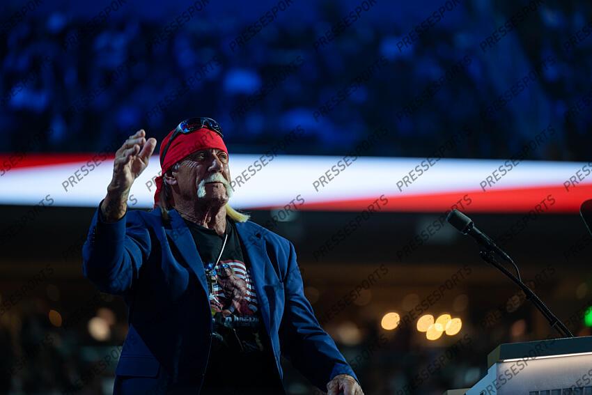 Professional wrestler Hulk Hogan speaks at the Republican National Convention in Milwaukee, Wisconsin at the Fiserv Forum on Thursday, July 19, 2024. Credit: Annabelle Gordon / CNP HULK HOGAN