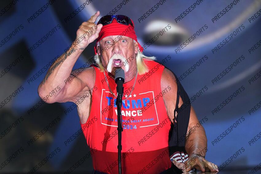 July 18, 2024; Milwaukee, WI, USA; Hulk Hogan, professional entertainer and wrestler, speaks during the final day of the Republican National Convention at the Fiserv Forum. The final day of the RNC featured a keynote address by Republican presidential nominee Donald Trump. Mandatory Credit: Jasper Colt-USA TODAY HULK HOGAN