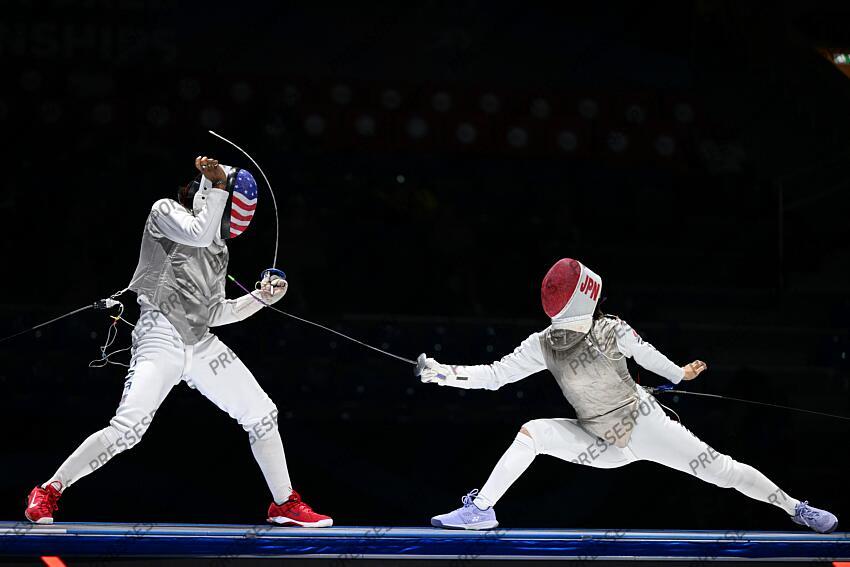 Japan's Sumire Tsuji (R) fights against United States' Lauren Scruggs during the 2025 World Fencing Championships Women's Foil team competition semi-finals match in Tbilisi, Georgia, on July 28, 2025. (Photo by AFLO) fleuret fleuret par equipe femmes EPREUVES DE FLEURET