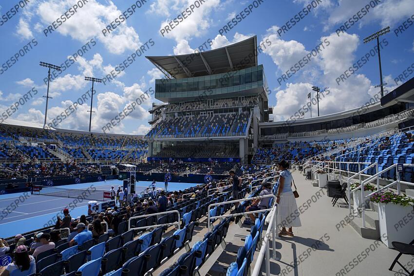 Aug 6, 2025; Cincinnati, OH, USA; Fans gather to watch players practice during the Cincinnati Open at the Lindner Family Tennis Center. Mandatory Credit: Aaron Doster-Imagn Images CINCINNATI OPEN