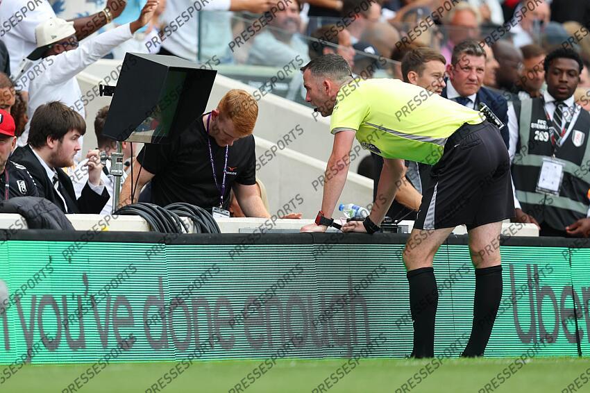 24 August 2025, London - Premier League Football - Fulham v Manchester United - Referee Chris Kavanagh checks the VAR screen - Photo: Charlotte Wilson / Offside. FULHAM-MANCHESTER UNITED (1-1)