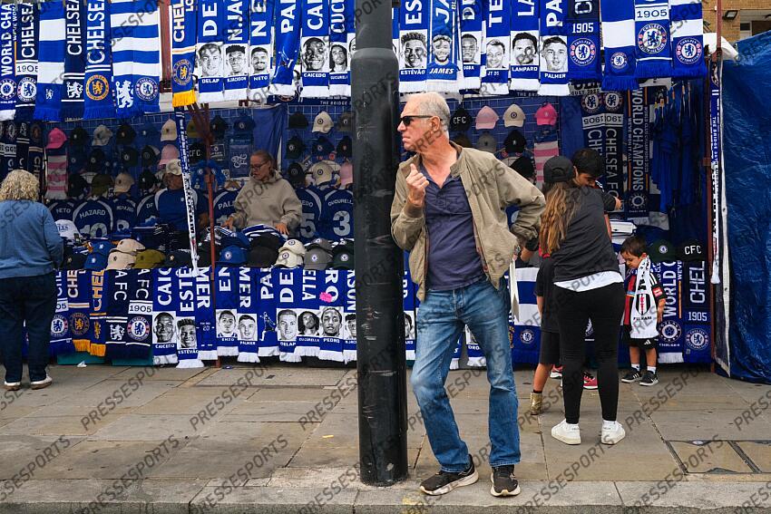 30 August 2025, London - Premier League Football - Chelsea v Fulham - A man stands by a Chelsea merch stand - Photo: Jacques Feeney / Offside. CHELSEA-FULHAM (2-0)