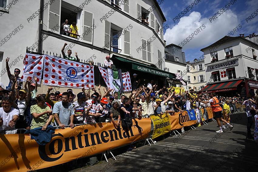 CYCLISME TOUR DE FRANCE 2025 2025 MANTES-LA-VILLE/PARIS CHAMPS-ELYSEES PARIS FRANCE 27/07/2025 MANTEY STEPHANE ambiance rue Lepic distribution de produits publicitaires Leclerc