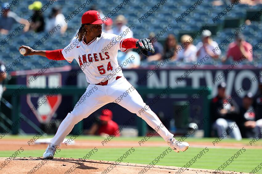 Sep 10, 2025; Anaheim, California, USA; Los Angeles Angels starting pitcher Jose Urena (54) pitches during the first inning against the Minnesota Twins at Angel Stadium. Mandatory Credit: Kiyoshi Mio-Imagn Images Minnesota Twins at Los Angeles Angels