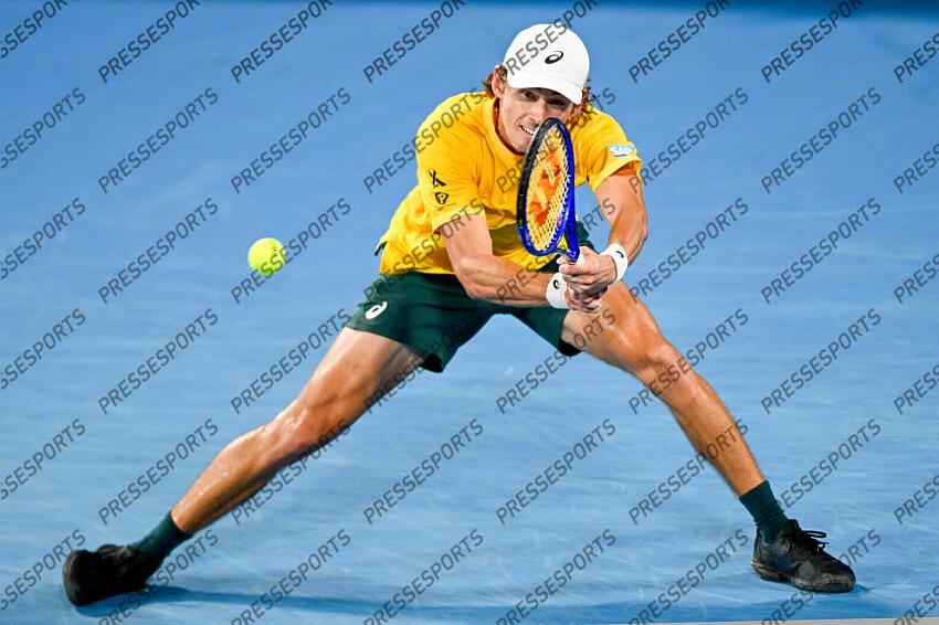Alex de Minaur of Australia hits a return against Zizou Bergs of Belgium during the 2025 Davis Cup Qualifier second round match between Australia and Belgium at Ken Rosewall Arena on September 14, 2025 in Sydney, Australia.(Photo by Izhar Khan) RESTRICTED TO EDITORIAL USE. STRICTLY NO COMMERCIAL USE AUSTRALIE VS BELGIQUE (2-3)