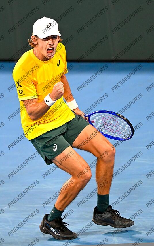 Alex de Minaur of Australia celebrates winning match point against Zizou Bergs of Belgium during the 2025 Davis Cup Qualifier second round match between Australia and Belgium at Ken Rosewall Arena on September 14, 2025 in Sydney, Australia. (Photo by Izhar Khan) RESTRICTED TO EDITORIAL USE. STRICTLY NO COMMERCIAL USE AUSTRALIE VS BELGIQUE (2-3)