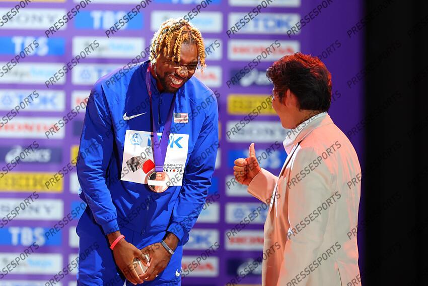(L to R) Noah LYLES (USA), Yuji Oda, SEPTEMBER 15, 2025 - Athletics : World Athletics Championships Tokyo 2025 Men's 100m Medal Ceremony at National Stadium in Tokyo, Japan. (Photo by Yohei Osada/AFLO SPORT) CHAMPIONNATS DU MONDE D'ATHLETISME A TOKYO